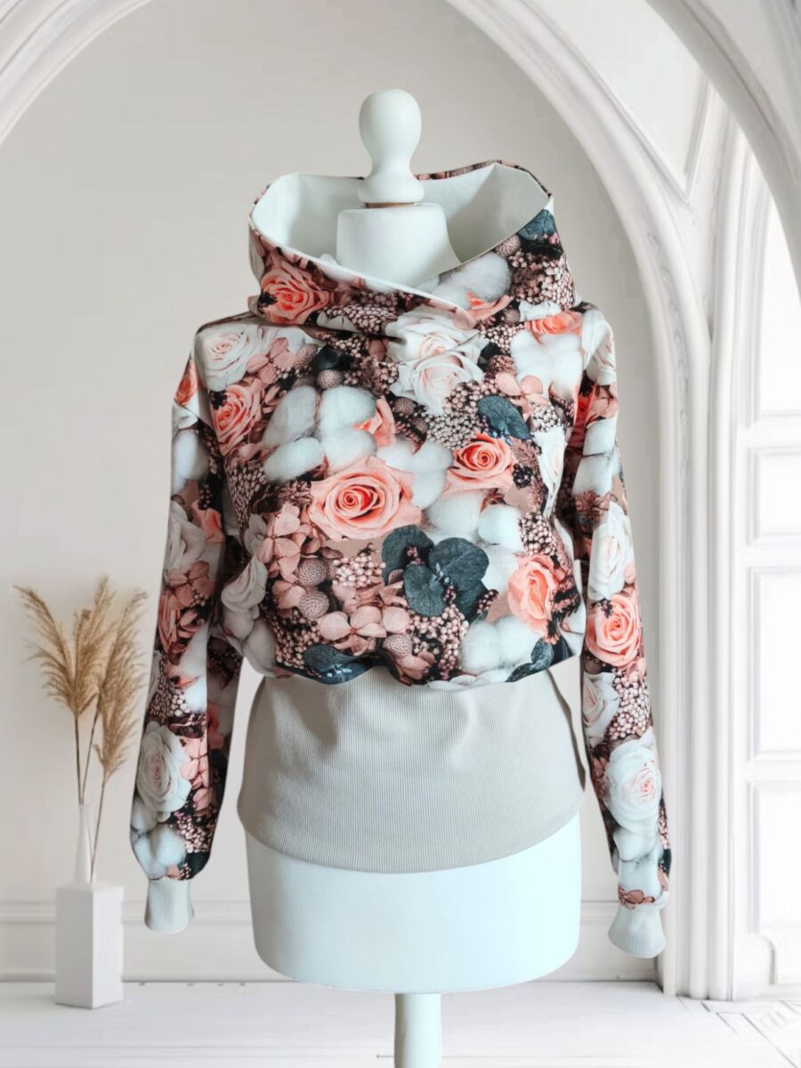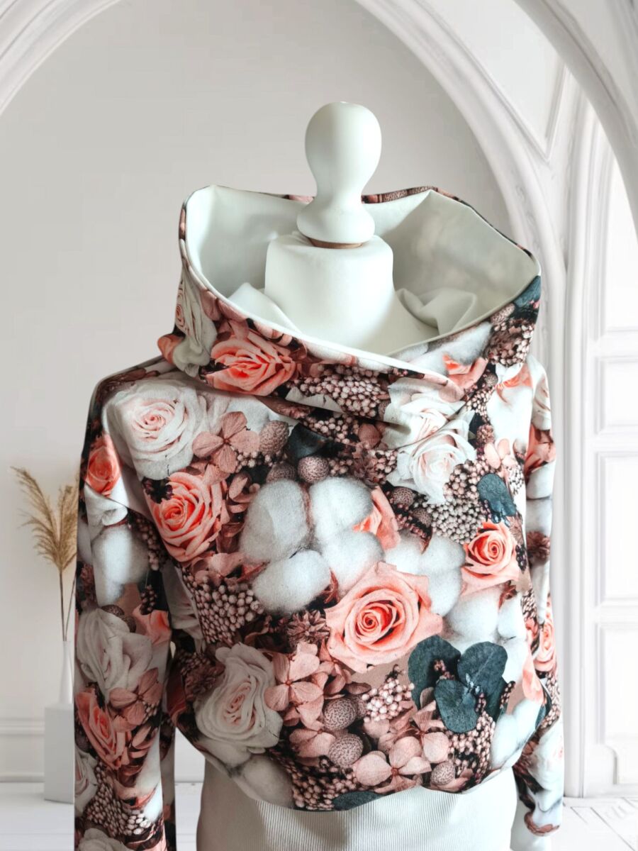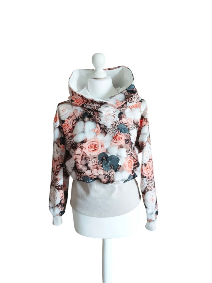 Bluza damska róże z kapturem uszyta z cudownie miękkiej dresówki bawełnianej najwyższej jakości premium z nadrukiem cyfrowym w pięknym motywie, wykończona na dole szerokim ściagaczem.