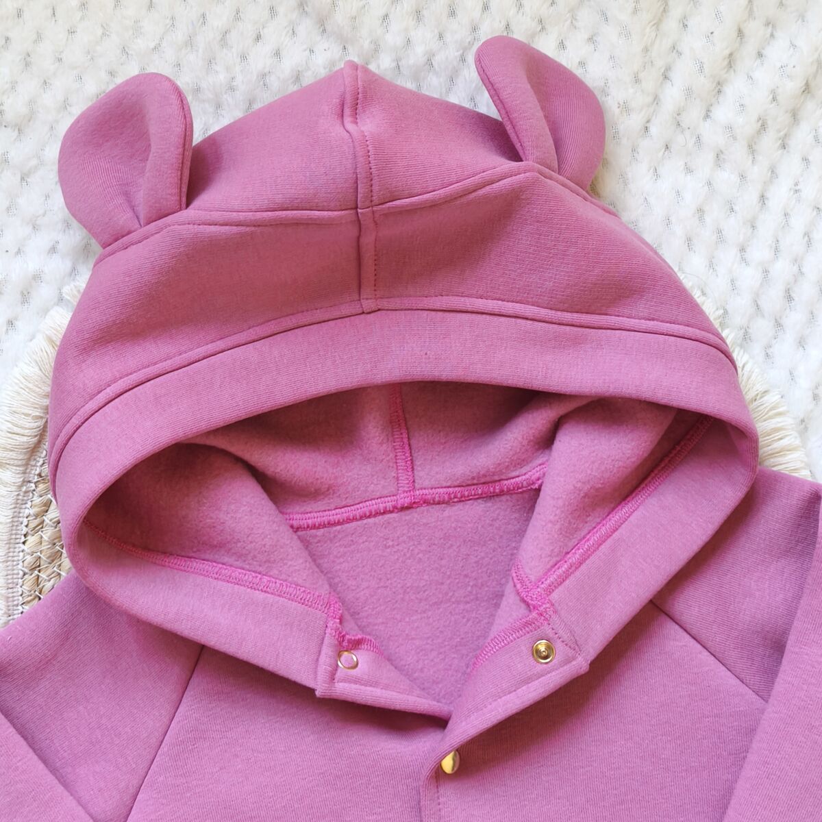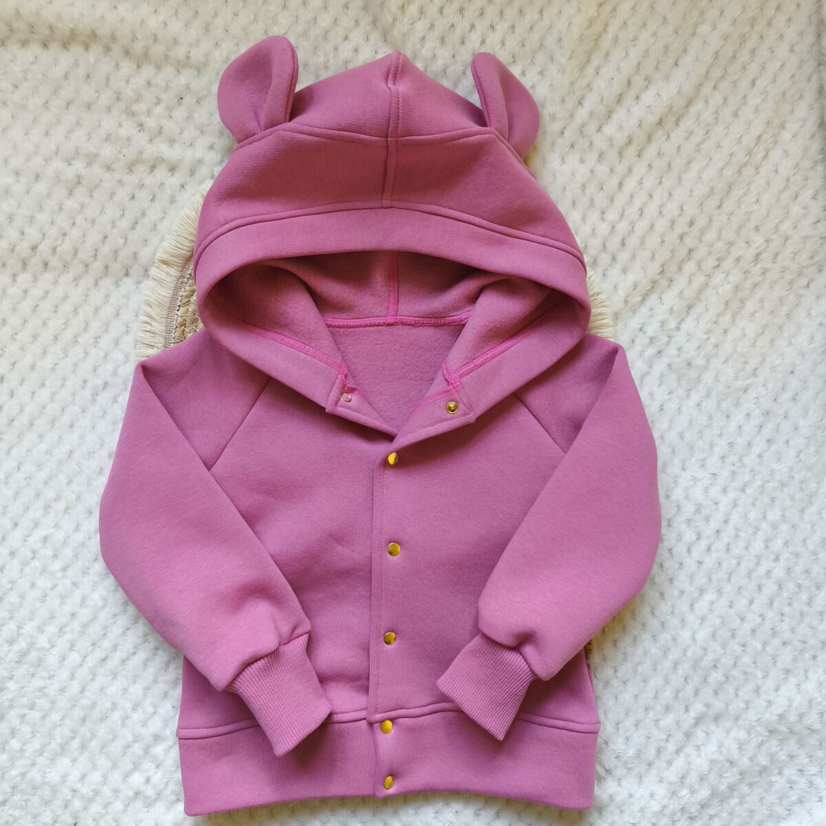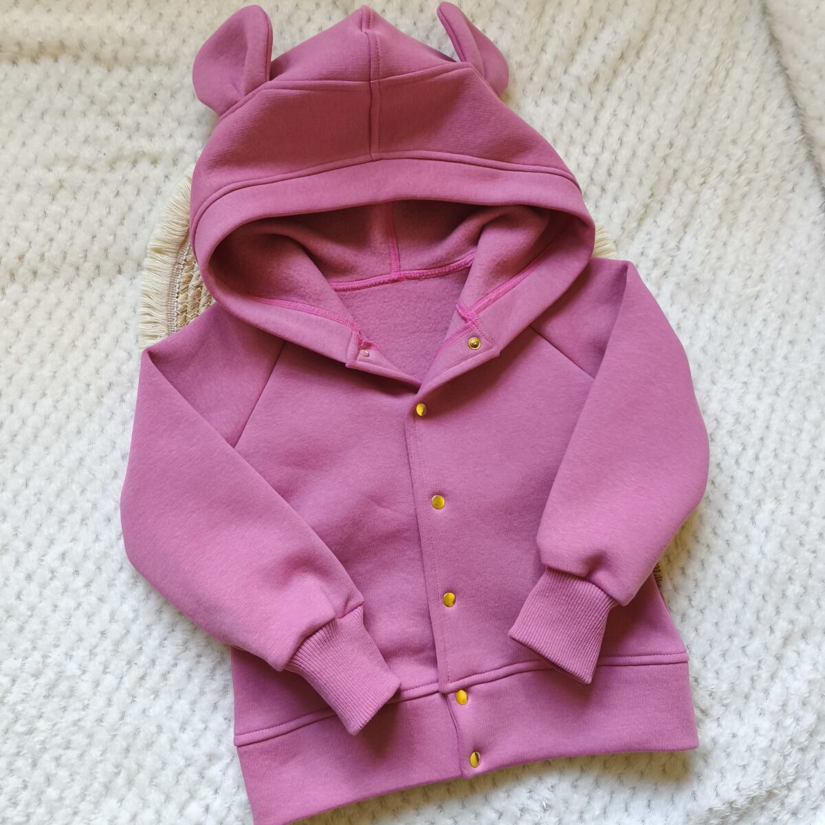 Ocieplana bluza dla dziewczynki kwarcowy róż z uszami misia rozpinana, uszyta z cudownie miękkiej dresówki drapanej najwyższej jakości.