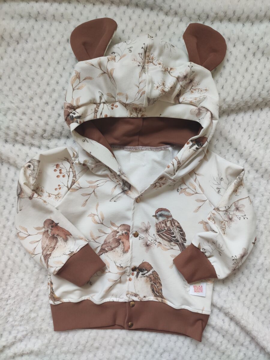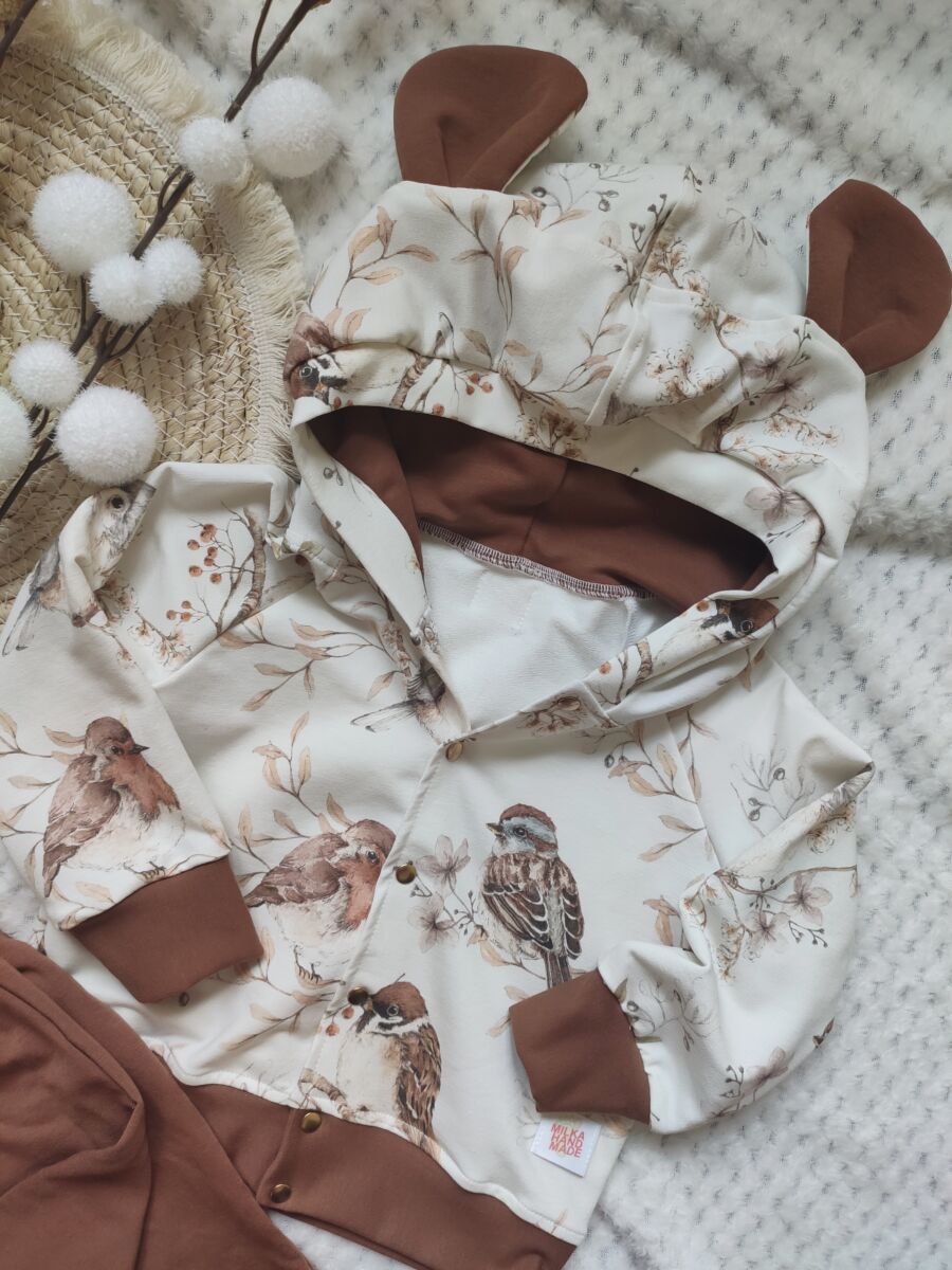 Bluza wróble na beżu rozpinana z kapturem uszyta z cudownie miękkiej dresówki bawełnianej najwyższej jakości premium z nadrukiem cyfrowym w pięknym dziecięcym motywie.