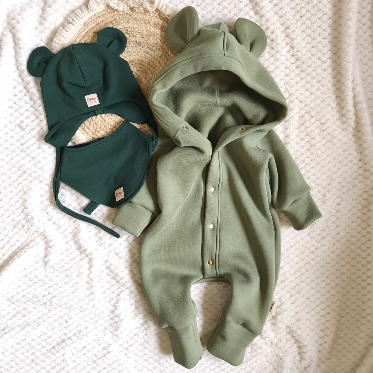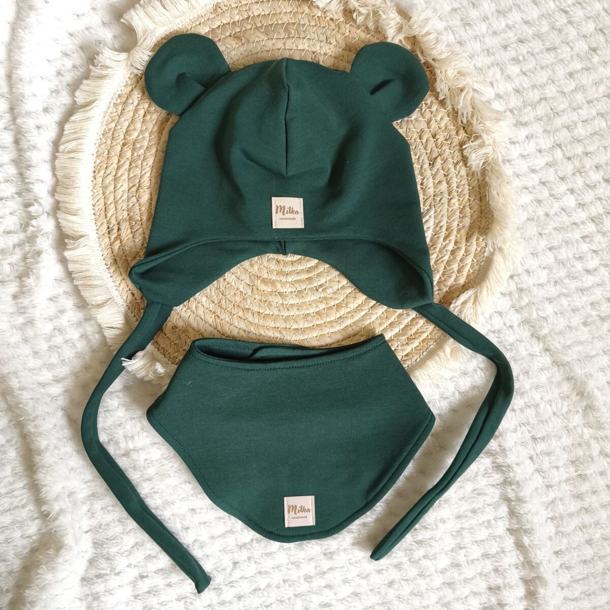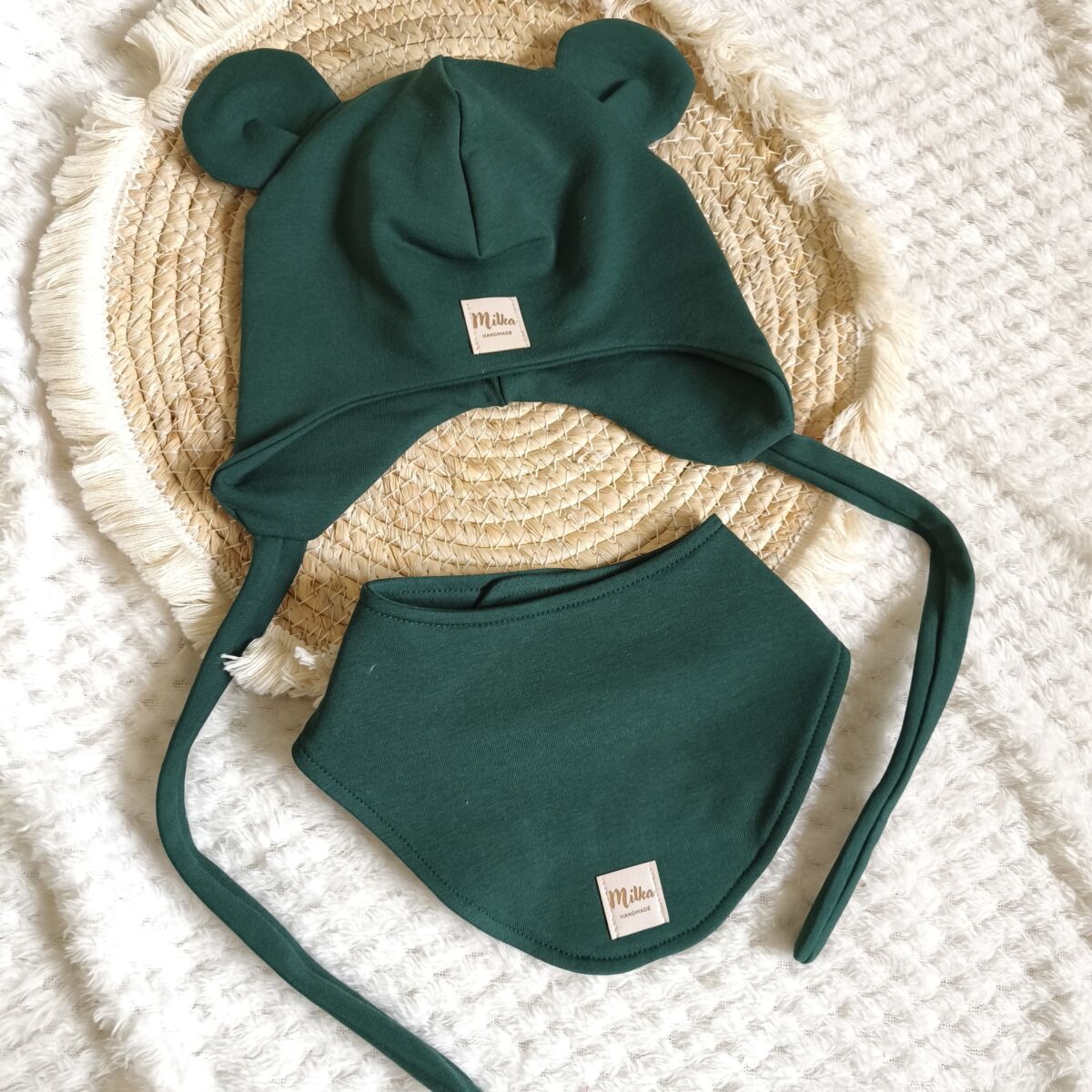 Czapeczka i chustka niemowlęca butelkowa zieleń może stanowić zestaw z kombinezonami dostępnymi na stronie np. Kombinezon ocieplany butelkowa zieleń