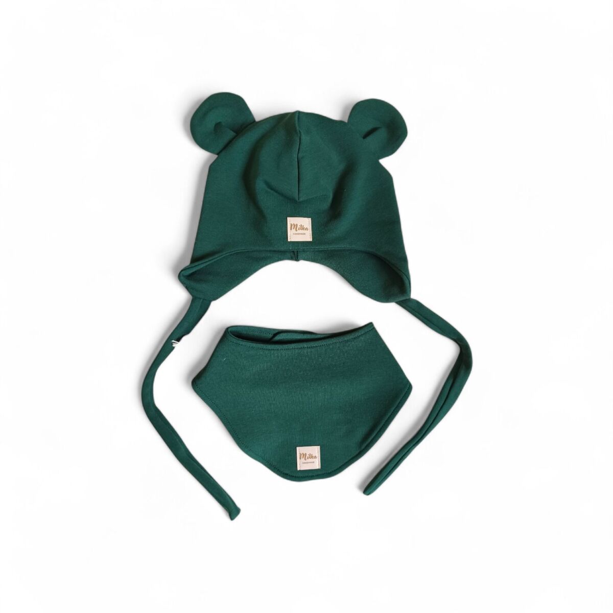 Czapeczka i chustka niemowlęca butelkowa zieleń, idealny zestaw na chłodniejsze dni.