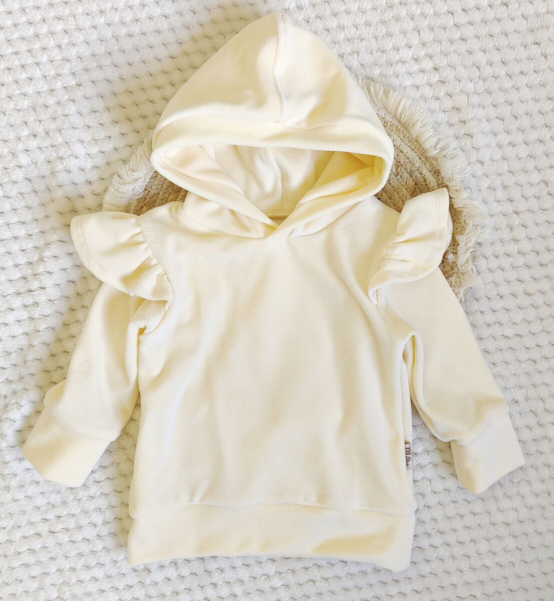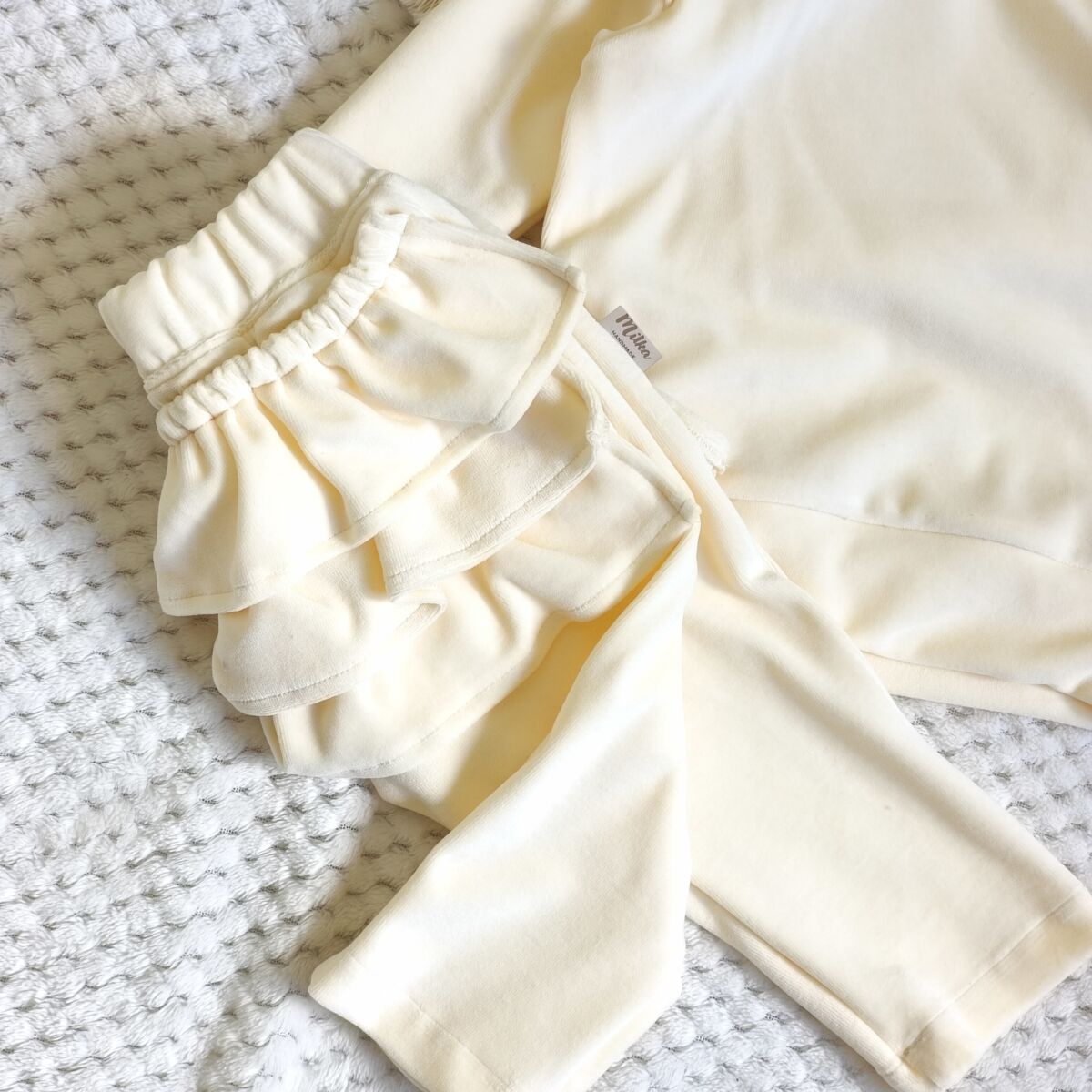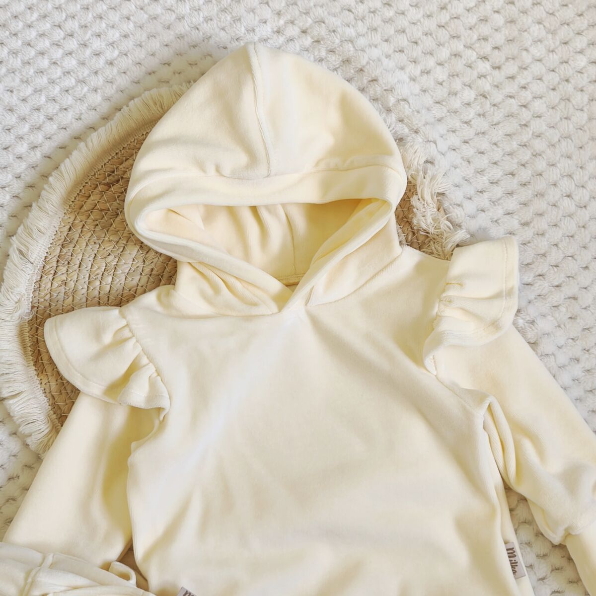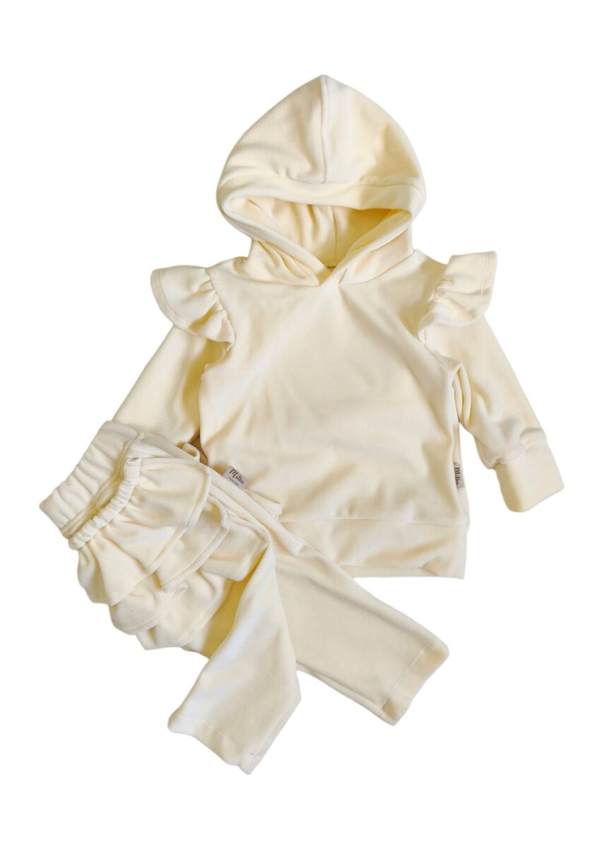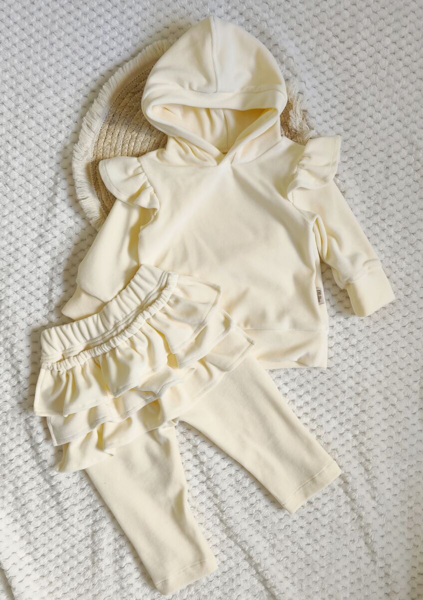 Dres welurowy dla dziewczynki śmietankowy- bluza dresowa z kapturem z weluru bawełnianego w pięknym śmietankowym kolorze, rękawy z ozdobnymi falbanami, do kompletu spodnie dresowe z trzema falbankami.