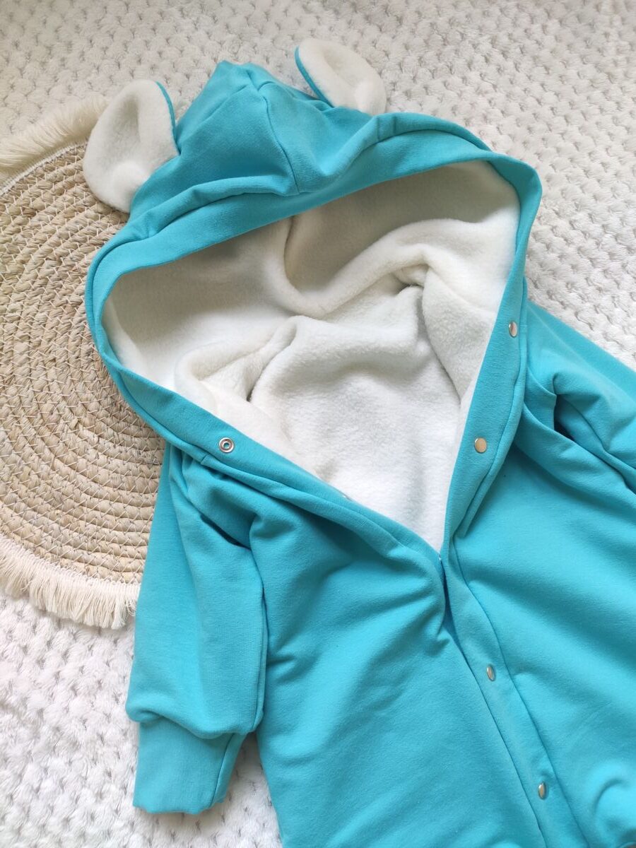 Kombinezon jesienny niebieski z ociepleniem, wykonany z najwyższej jakości dzianiny bawełnianej oraz wewnętrznej warstwy w postaci polaru.