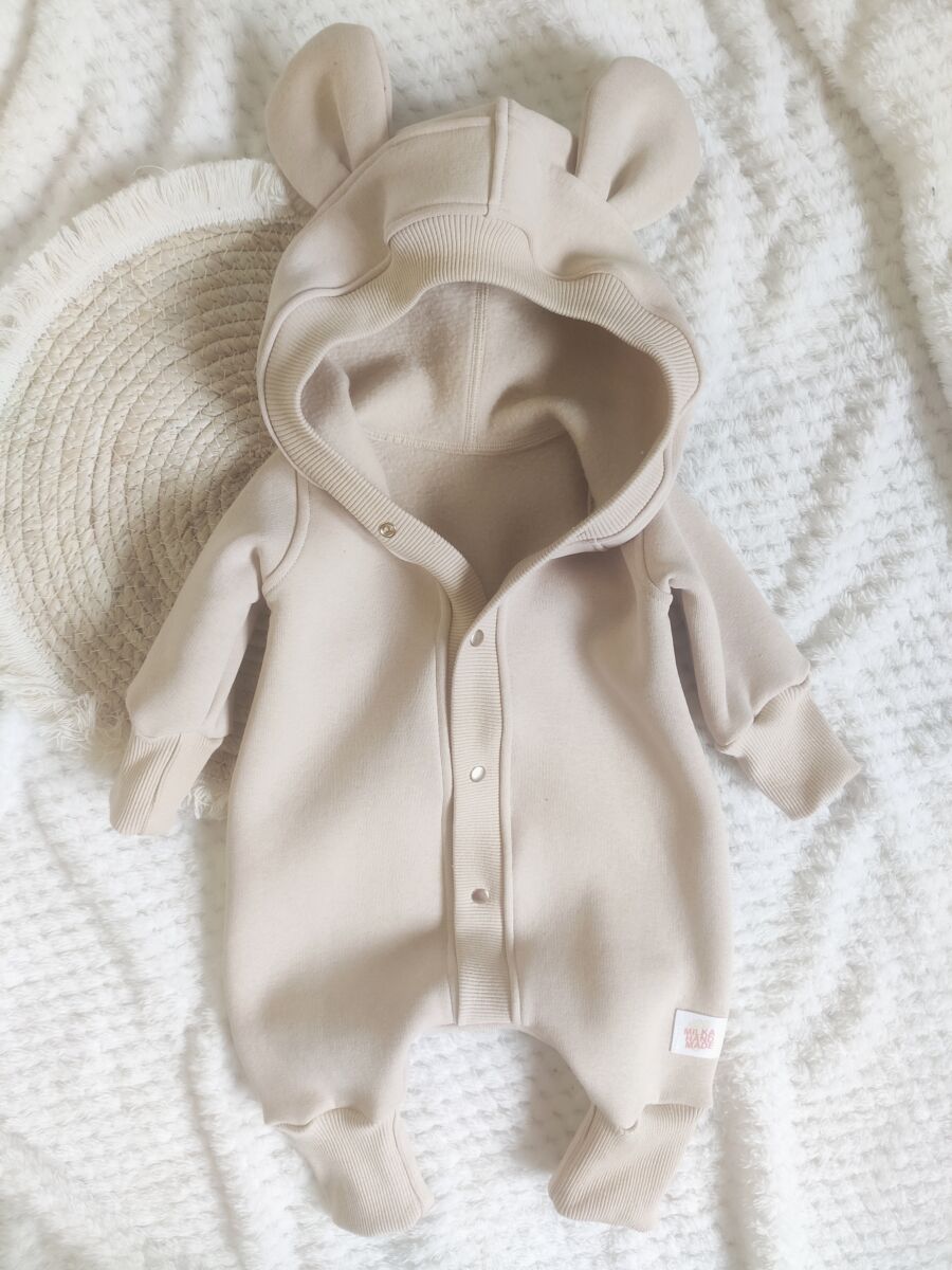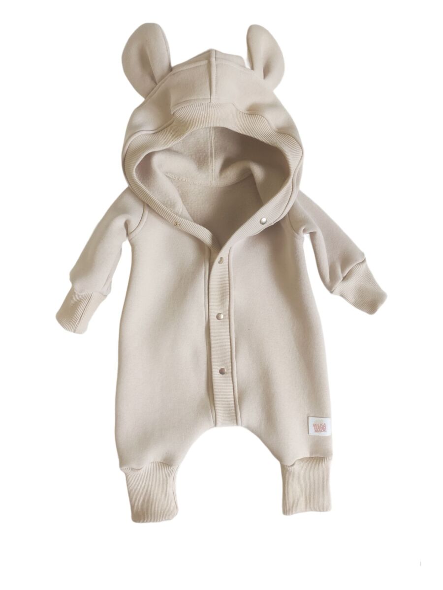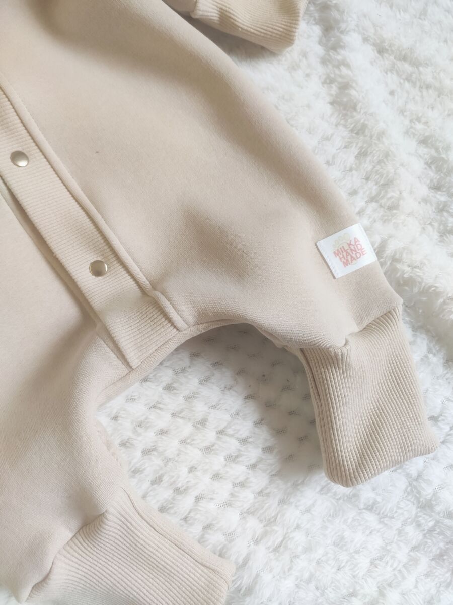 Kombinezon ocieplany beżowy wykonany z najwyższej jakości dzianiny bawełnianej drapanej, z charakterystycznym meszkiem po lewej stronie.