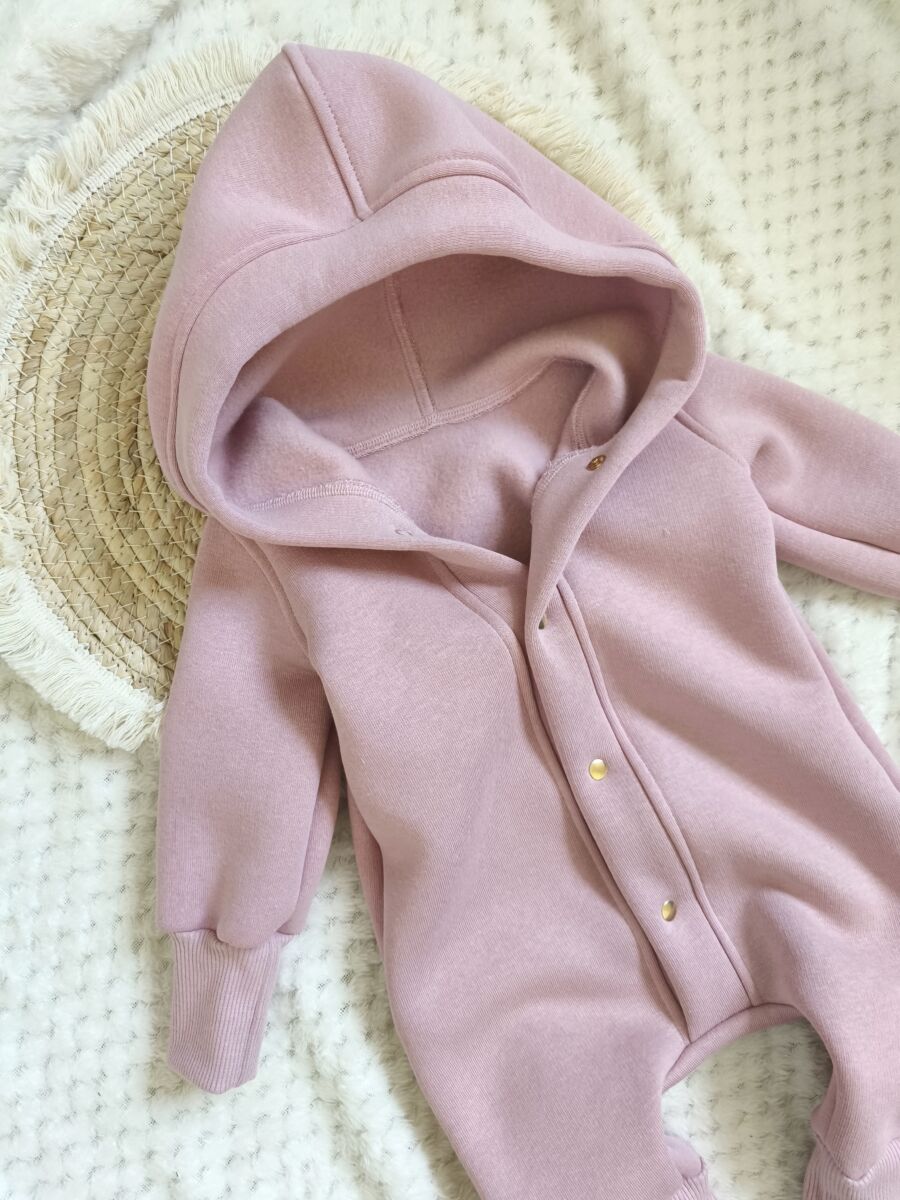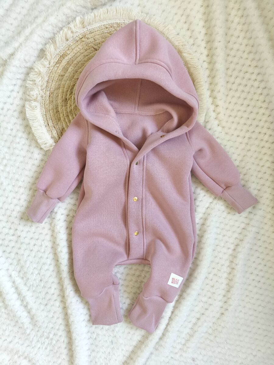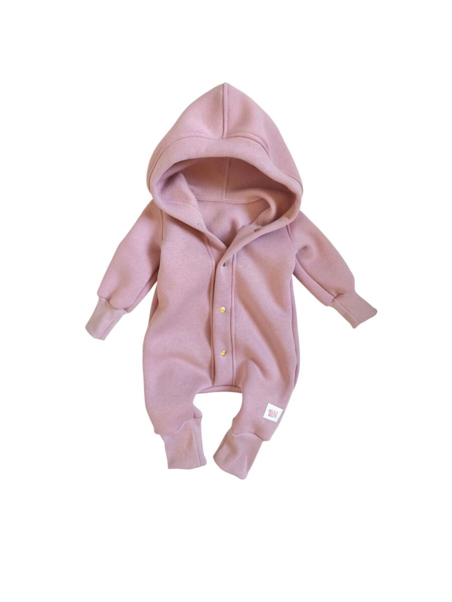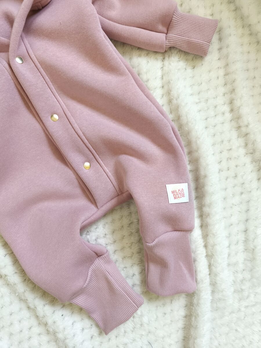 Kombinezon ocieplany brudny róż wykonany z najwyższej jakości dzianiny bawełnianej drapanej, z charakterystycznym meszkiem po lewej stronie. Idealny na cieplejszą wiosnę i chłodniejsze lato.