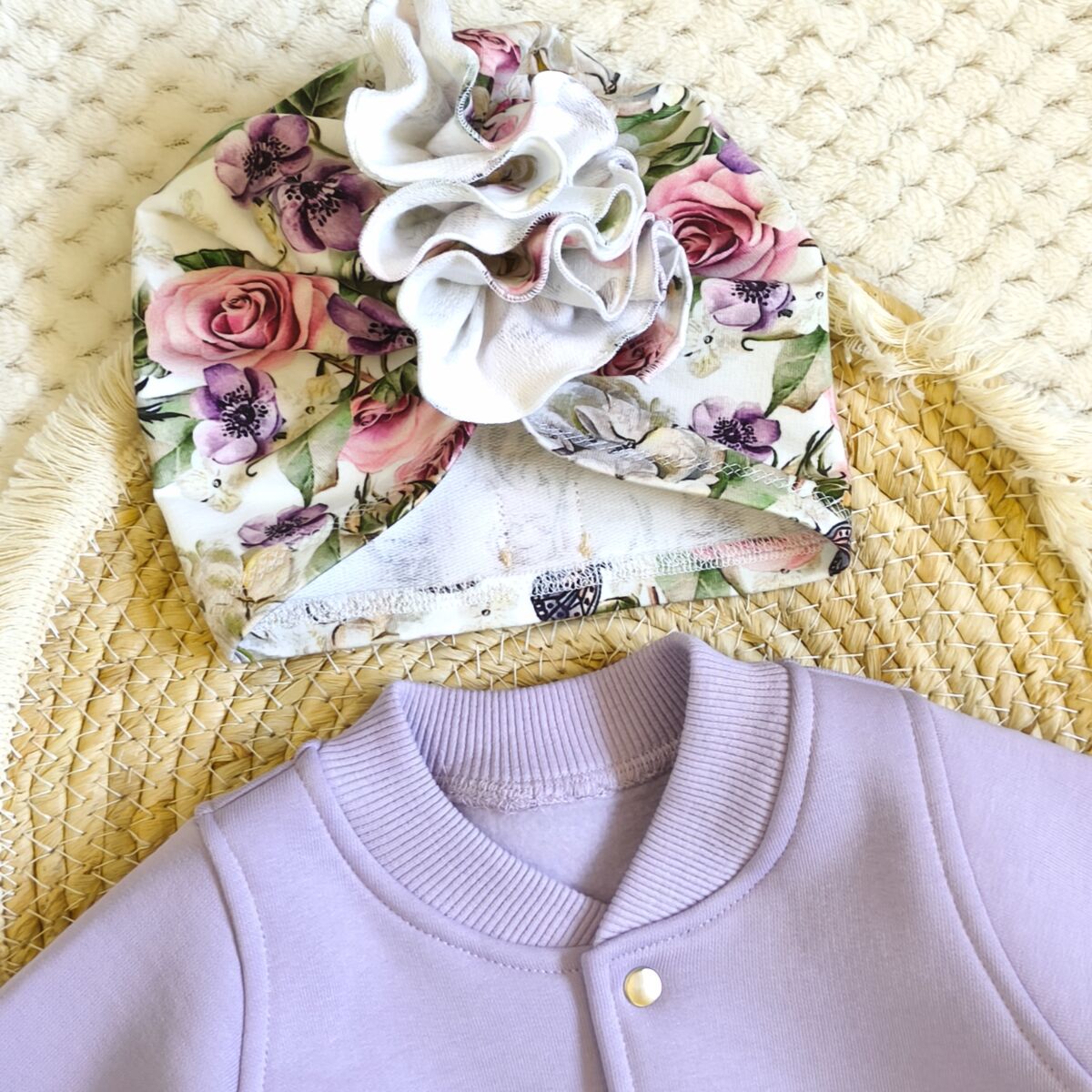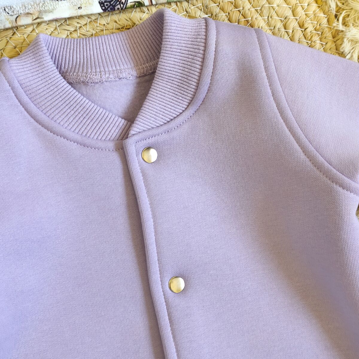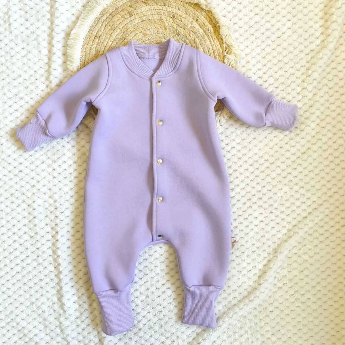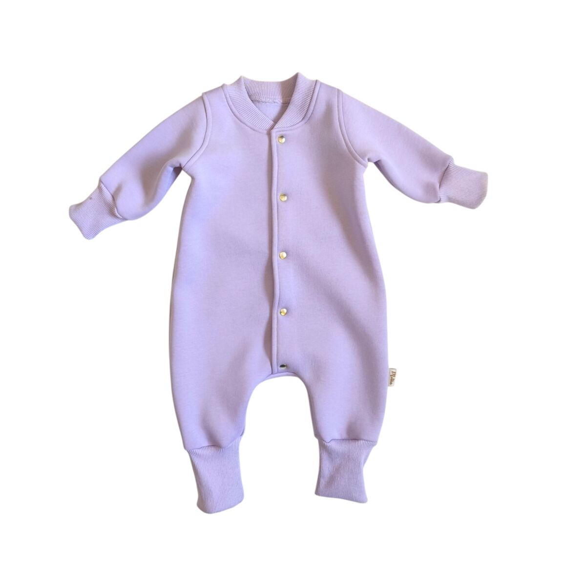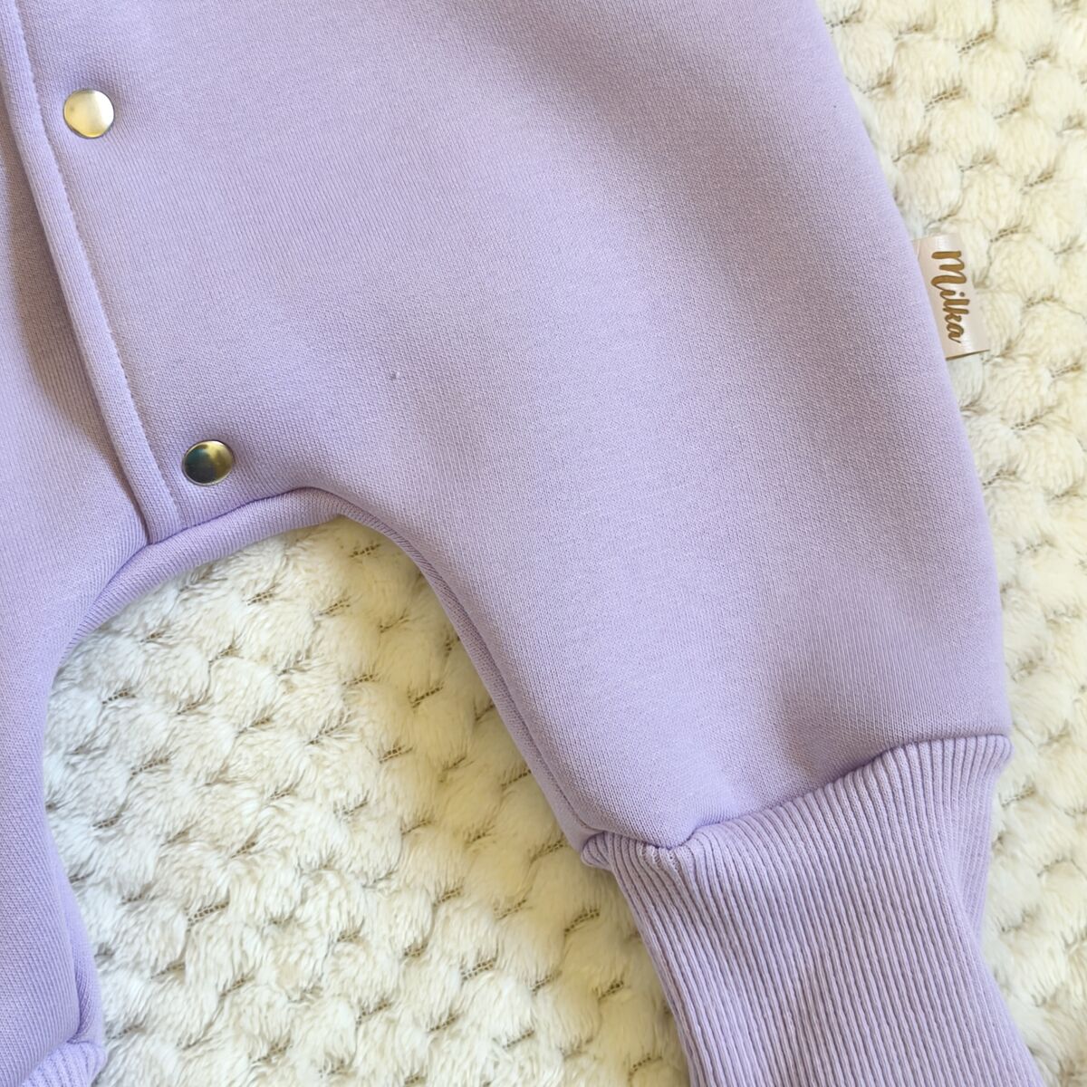Kombinezon ocieplany lawendowy dla dziewczynki wykonany z najwyższej jakości dzianiny bawełnianej drapanej, z charakterystycznym meszkiem po lewej stronie.