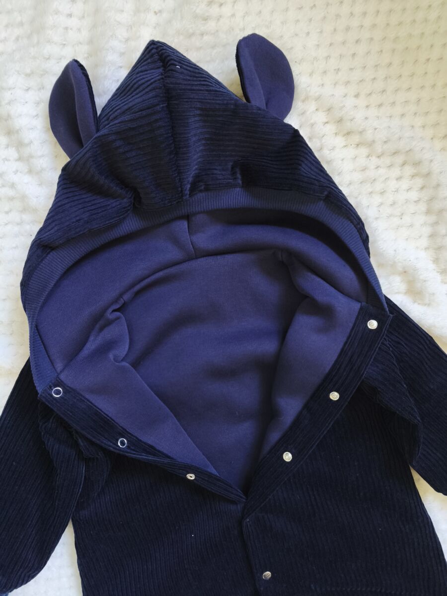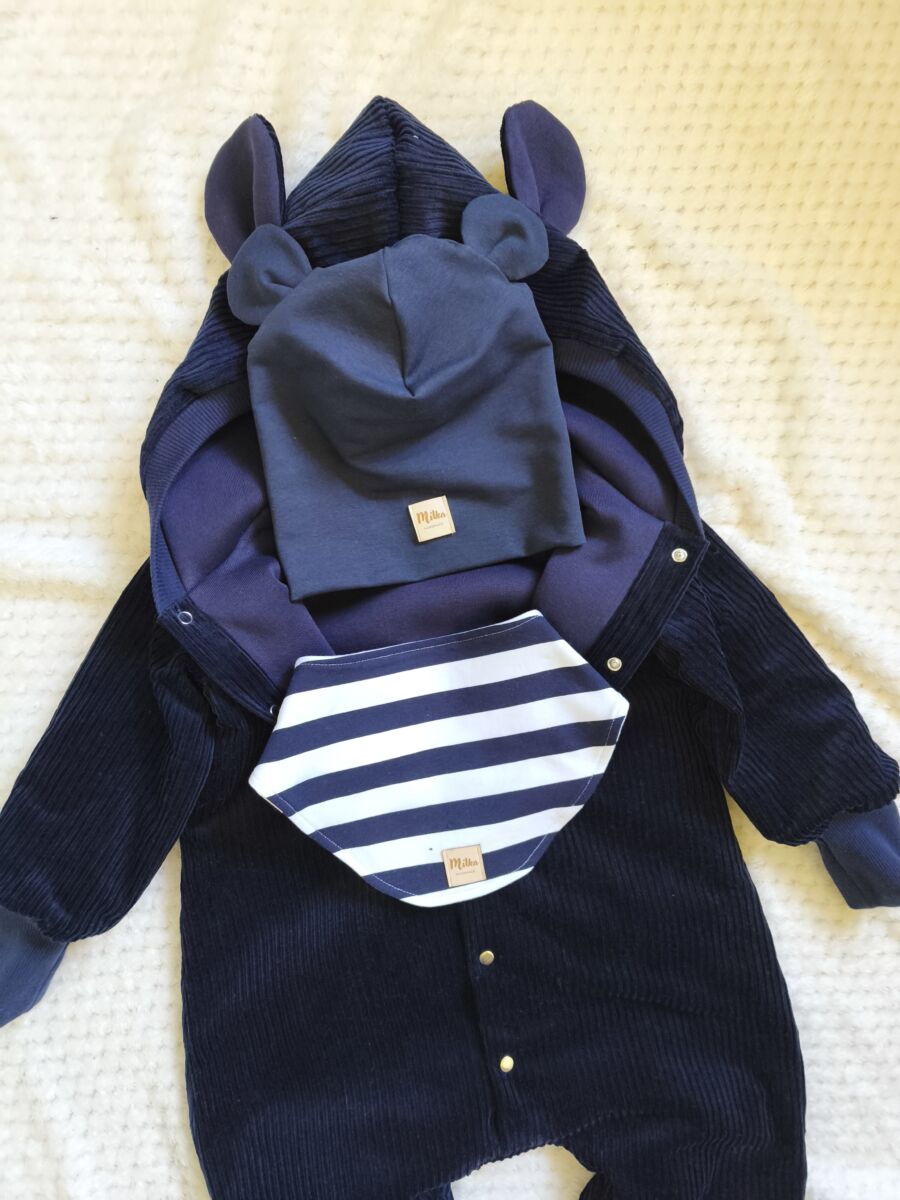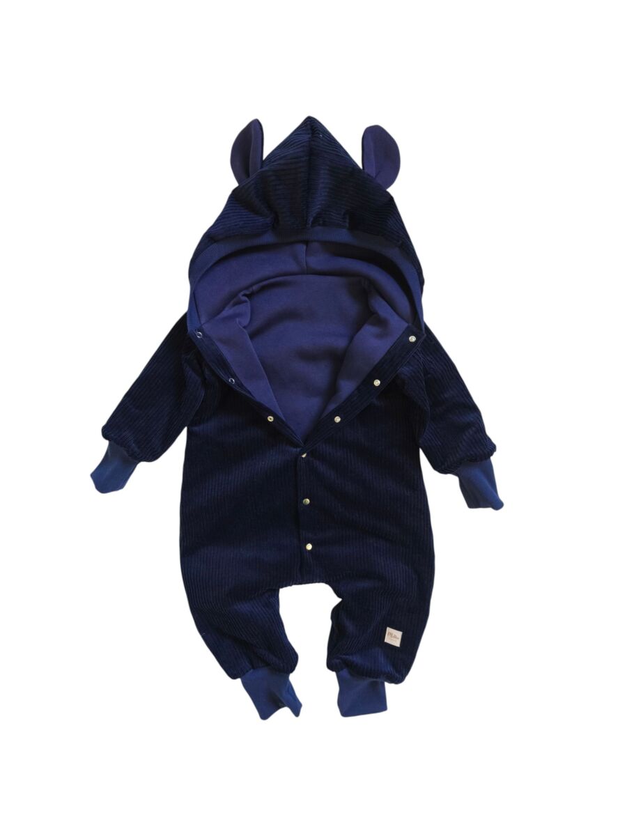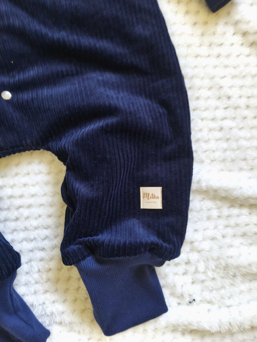 Kombinezon sztruksowy niemowlęcy granatowy , wykonany z najwyższej jakości sztruksu (bawełna 100%), oraz z wypełnienia w postaci dresówki bawełnianej drapanej w kolorze granatowym ( skład bawełna 90% poliester 10%).