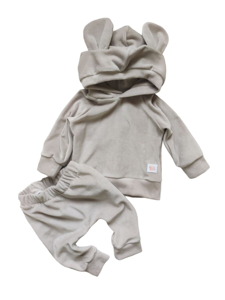 Komplet welurowy dla dzieci beżowy- bluza dresowa z kapturem z weluru bawełnianego, kaptur wykończony uszami misia, do kompletu spodnie baggy.