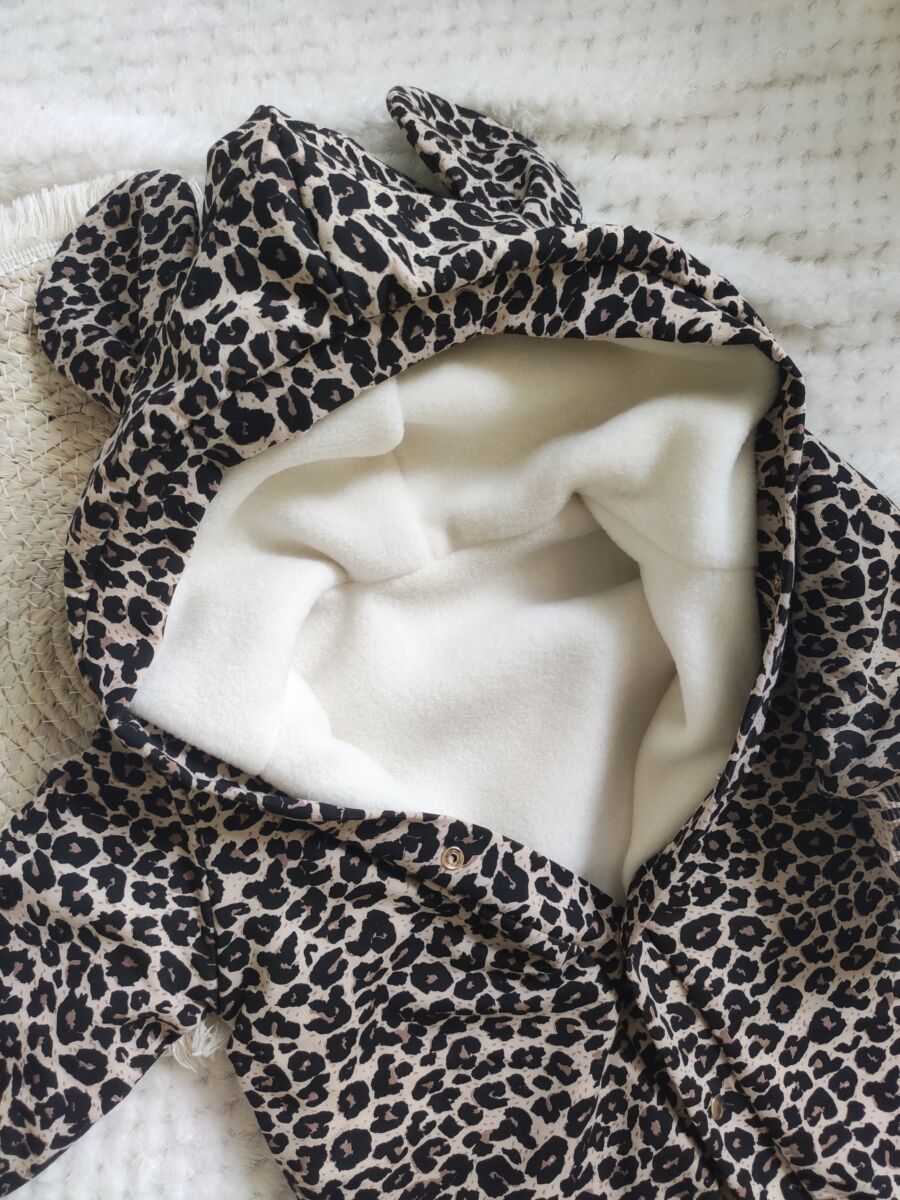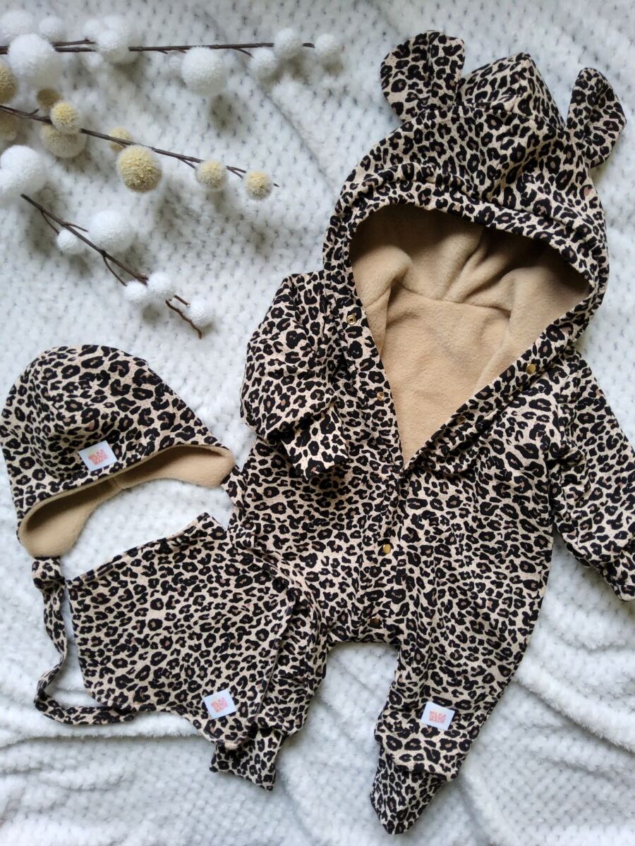Kombinezon dla dziewczynki w panterkę z uszami misia na beżu, wykonany z najwyższej jakości dzianiny bawełnianej, z ociepleniem w postaci polaru.