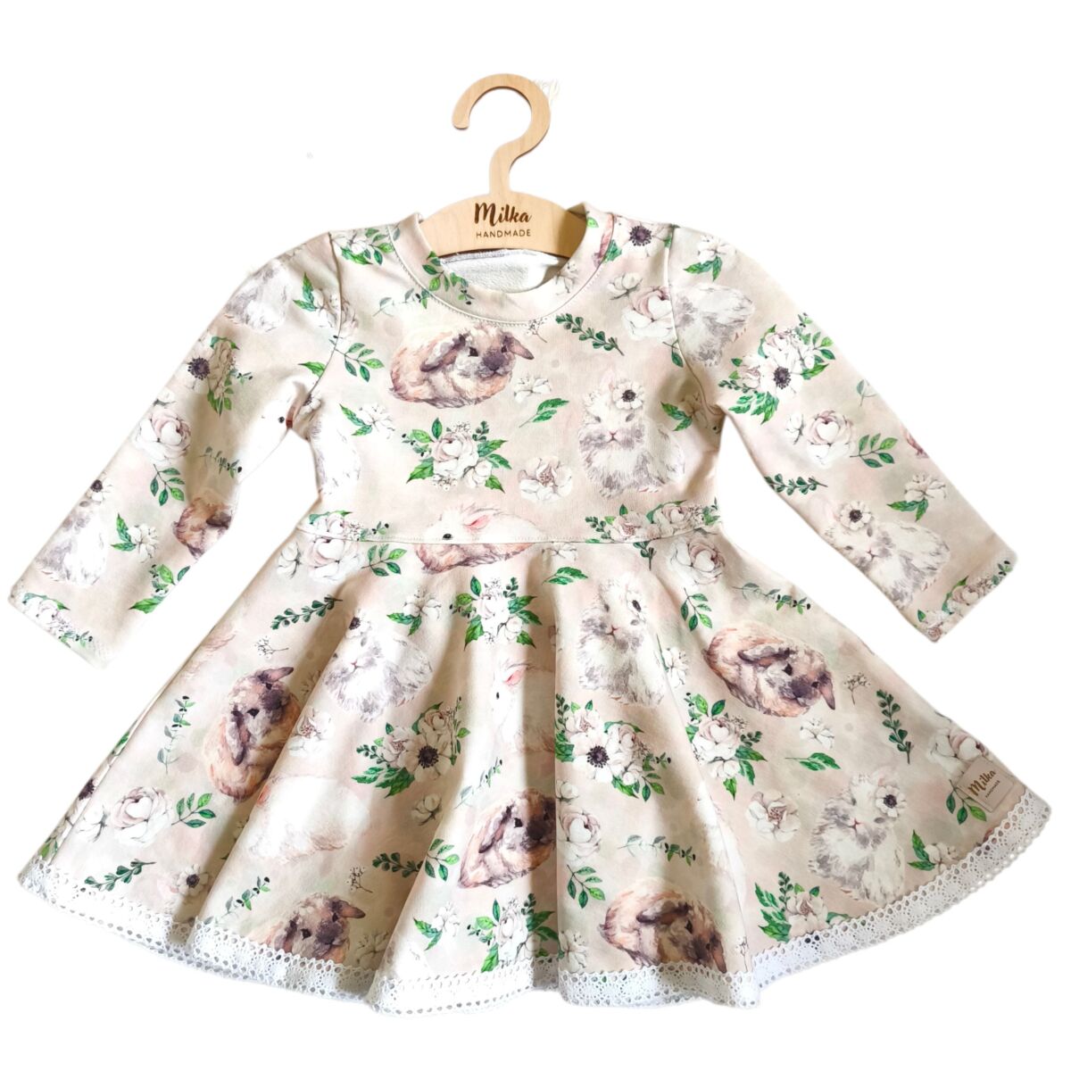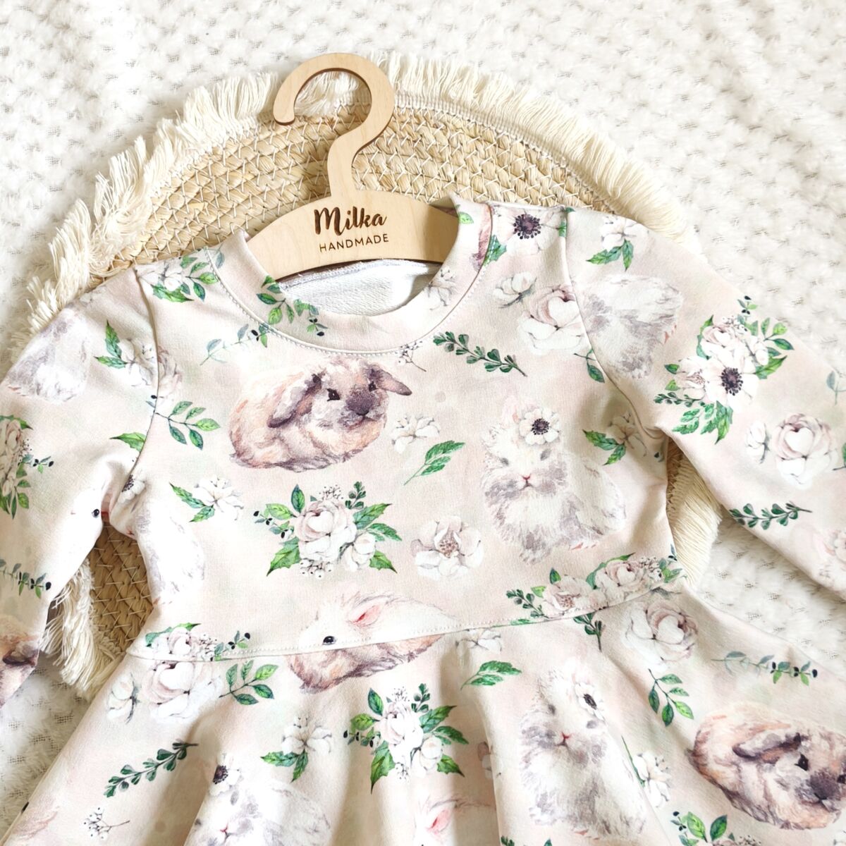 Sukienka dla dziewczynki króliczki uszyta z cudownie miękkiej dresówki bawełnianej najwyższej jakości premium z nadrukiem cyfrowym w pięknym dziecięcym motywie.